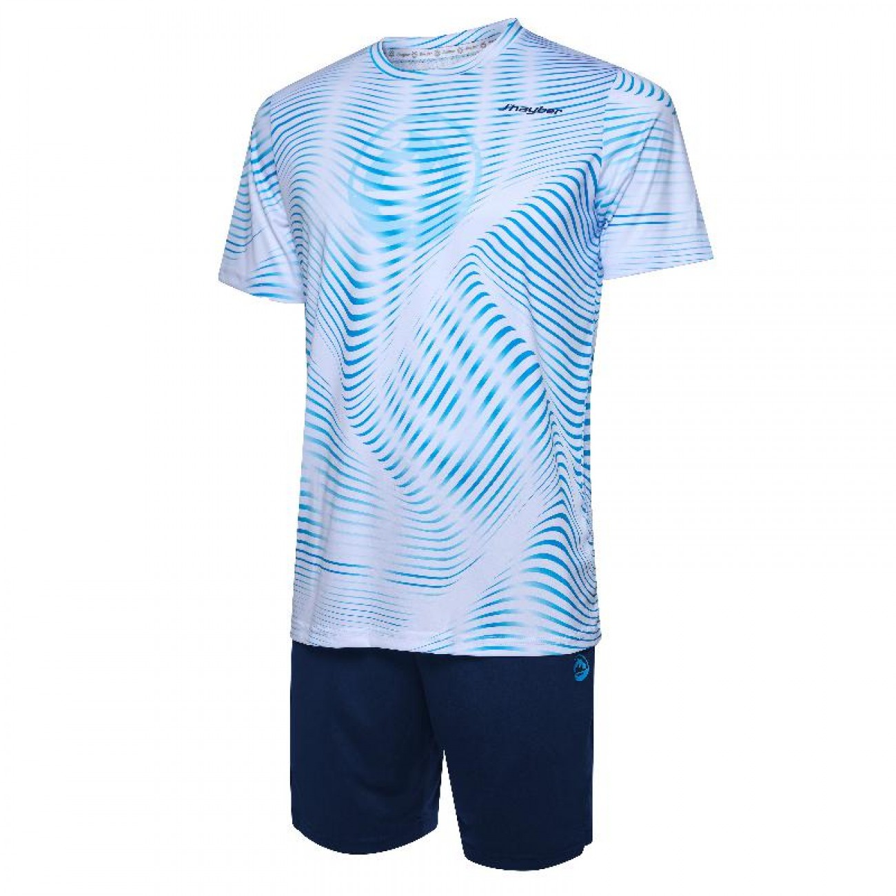 Su camiseta destaca por un diseño ondulado en tonos dinámicos que aporta energía y movimiento, mientras que el pantalón equilibra el look con un estilo más sobrio y contrastado.
